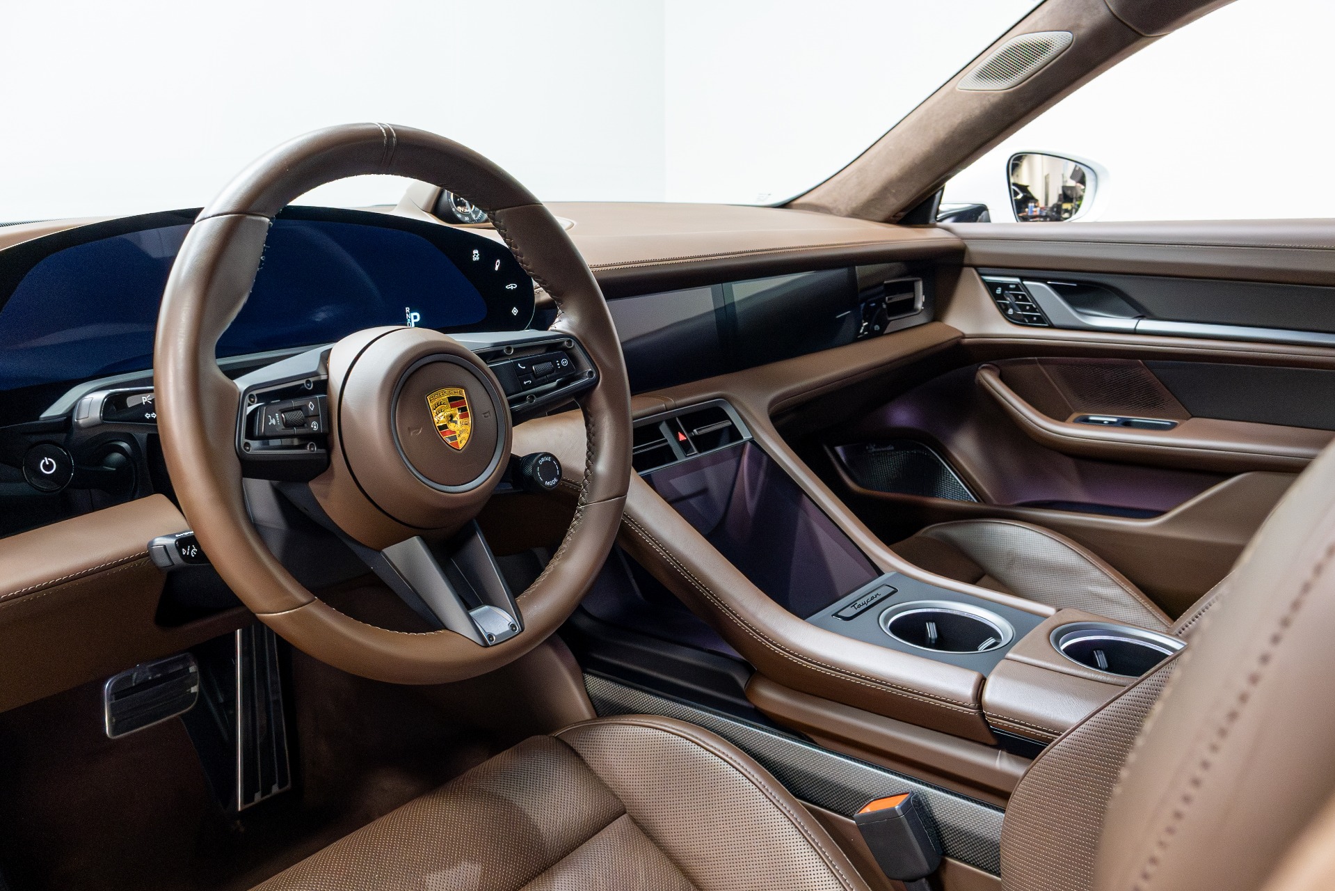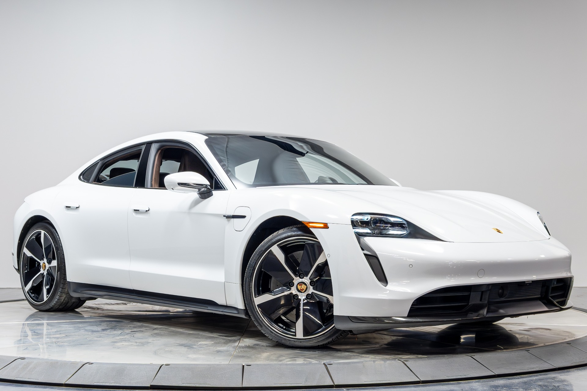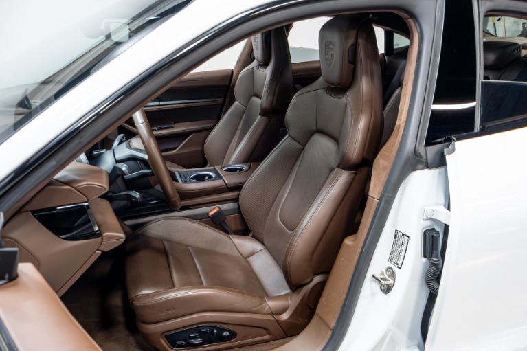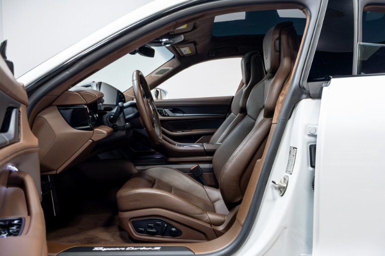 2020 PORSCHE TAYCAN TURBO S AWD ELECTRIC | CARRARA WHITE METALLIC | TRUFFLE BROWN OLEA CLUB LEATHER | BURMESTER 3D AUDIO | PASSENGER DISPLAY | CERAMIC BRAKES | GLASS ROOF | 21 EXCLUSIVE WHEELS